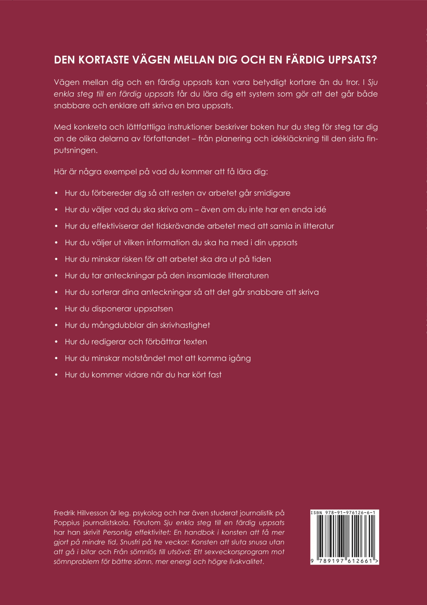 Fredrik Hillvesson är leg. psykolog, författare och föreläsare med mera. När han skrev sin egen uppsats hade han ont om tid på sig att bli klar. Han började därför leta efter information som kunde hjälpa honom att förenkla och snabba på uppsatsarbetet.